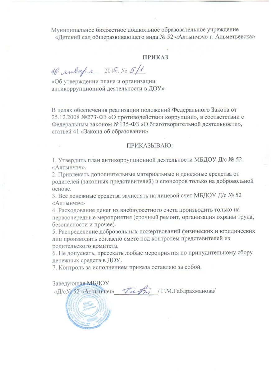 Приказ об утверждении плана и организации антикоррупционной деятельности