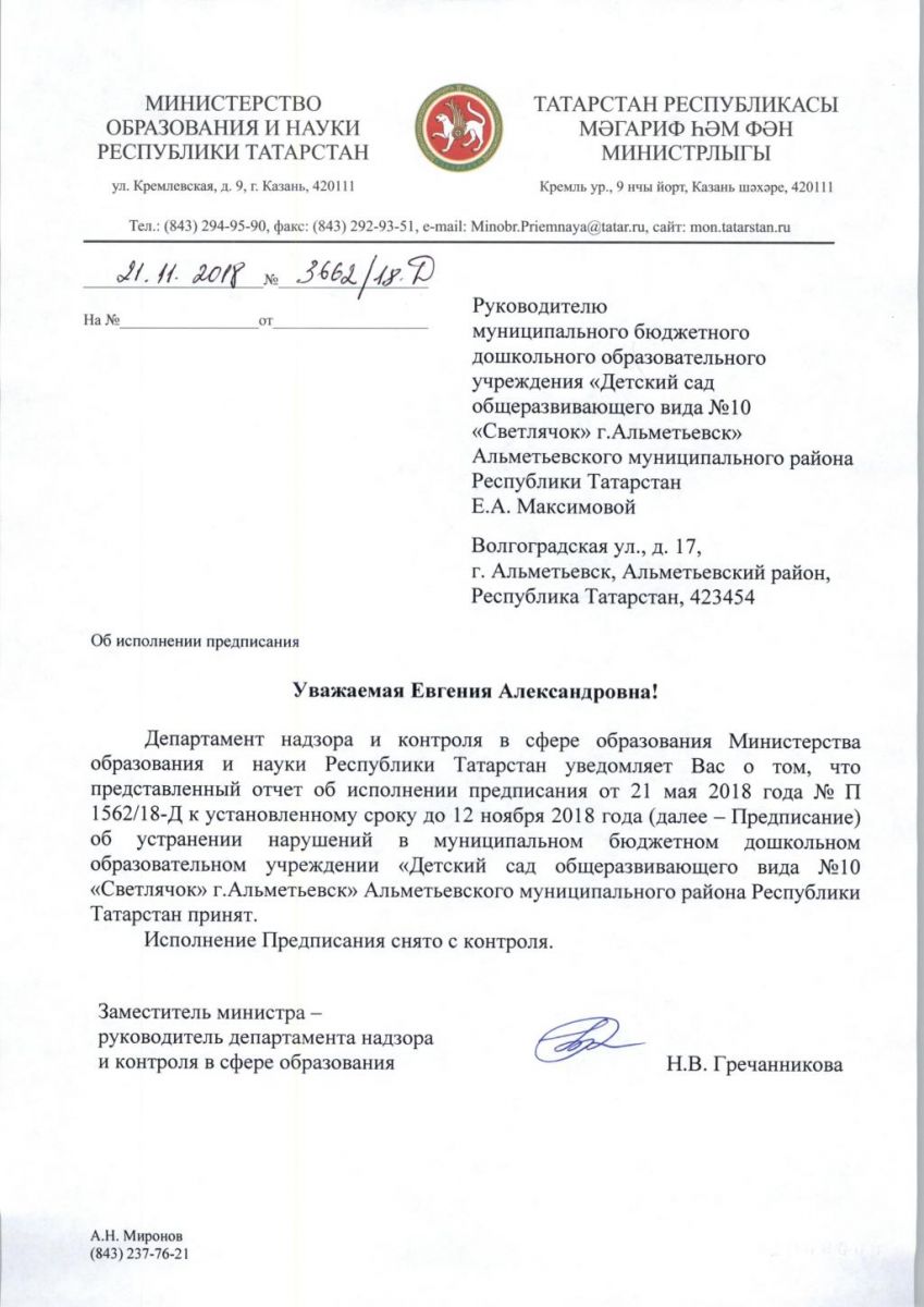 Отчет об исполнении предписания об устранении нарушений от 21 мая 2018г. № П 1562/18-Д