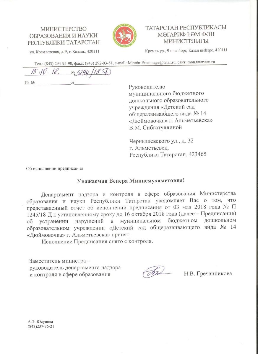 Об исполнении предписания Департамента надзора и контроля в сфере образования МО м Н РТ