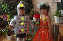 Наши воспитанники сегодня приняли участие в городском конкурсе "Детям-чистый город с безопасным движением!" Родители постарались и изготовили отличные костюмы из бросового материала. Наш дуэт шел под названием: "Планета Земля и ее космический патруль"