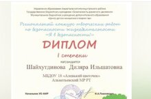 Воспитатель подготовительной группы Шайхутдинова Д.И. стала победителем регионального конкурса творческих работ по безопасности жизнедеятельности "Я в безопасности!". Поздравляем ее! Пусть все дети будут всегда в безопасности!