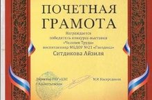 Поздравляем победителя конкурса-выставки "Человек Труда", воспитанницу МБДОУ № 21 "Гвоздика", Ситдикову Айзилю с почетной грамотой, врученной ГКУ "Центр занятости населения г. Альметьевска"