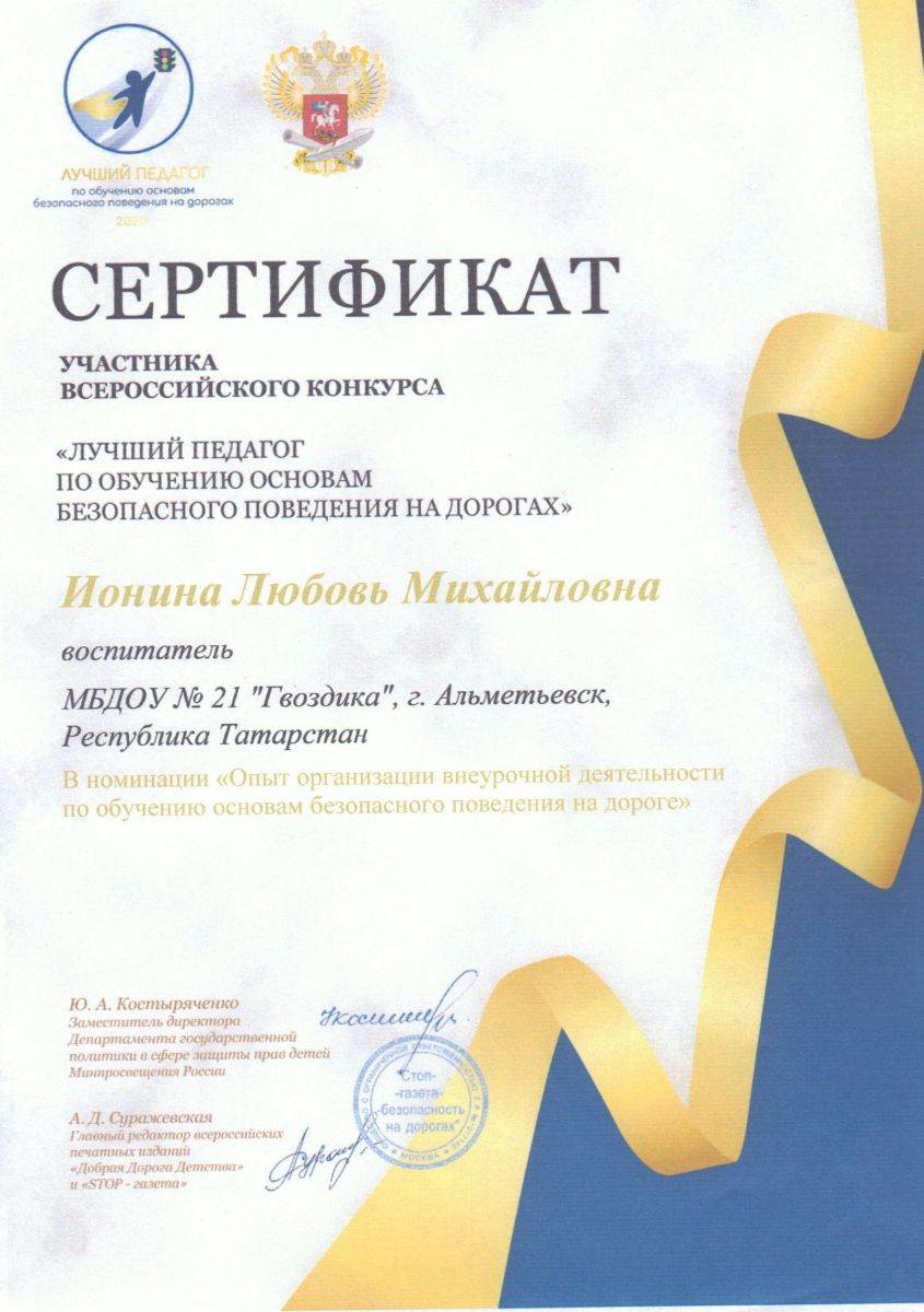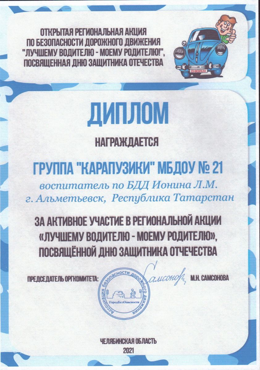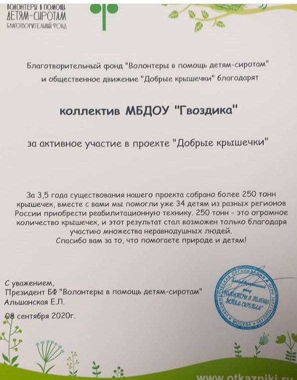 Благодарственная грамота за активное участие в проекте "Добрые крышечки" .2020 год.