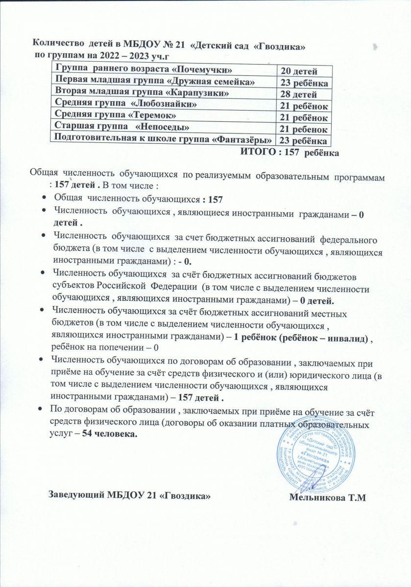 Количество детей в МБДОУ 21 "Гвоздика" по группам на 2022 - 2023 учебный год