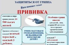 Уважаемые родители! Проводится всероссийская вакцинация против гриппа по Национальному проекту «Здоровье» Сделайте прививку! Защитите себя и Вашего ребёнка! Грипп опасен своими осложнениями. Именно осложнения гриппа приводят к печальным последствиям.После введения вакцины против гриппа в организме образуются антитела к вирусами гриппа, вырабатывается иммунитет. Назначение вакцины: профилактика гриппа, постгриппозных осложнений, облегчение течения заболевания. ПОМНИТЕ! Даже один человек, пренебрегающий своим здоровьем, может стать причиной распространения заразного заболевания. ЗАБОТА О СОХРАНЕНИИ И УКРЕПЛЕНИИ ЗДОРОВЬЯ – ОБЯЗАННОСТЬ И ПРЯМОЙ ДОЛГ КАЖДОГО ЧЕЛОВЕКА