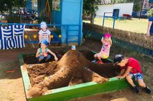 В нашем детском саду прошла неделя «Волшебная песочница» - создание построек из песка. Полёт фантазии не знал предела: морское дно с его обитателями; городок для гномиков, Маши и мишки и миньонов; торт для друзей. Идея творчества была так заразительна, что все ребята старались принять участие в строительстве.