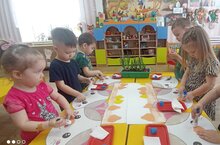 Коллективная работа по аппликации "Лук". Задачи: формировать навыки работы с клеем; развивать мелкую моторику пальцев рук и кистей; закрепить знания детей о луке и его пользе; пополнять активный словарь детей: луковица, золотистая.