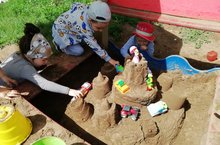 В солнечные дни дети с удовольствием играют с песком: строят песочные замки, парковки для машин, пекут торты. Фантазиям детей нет границ.