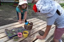 Лето - время игр на улице. Столько интересного вокруг - трава, шишки, камушки, только успевай придумывать! В группе "Золотая рыбка" сегодня девочки придумывали новые рецепты вкусностей к чаю: получился торт с ягодами и кексы.