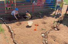 Сегодня на участке, дети старшей группы, вырыли траншеи и устроили, настоящий аквапарк для машин.