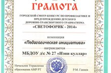 С 19 ноября по 3 декабря 2014 года проходил смотр-конкурс "Светофорик-2014" среди воспитателей дошкольных образовательных учреждений Альметьевского муниципального района. Цель- совершенствования форм и методов взаимодействия детского сада и семьи по формированию стереотипов безопасного поведения ребенка на улице и дороге. Участникам МБДОУ №27 вручили грамоту с номинацией "Педагогическая инициатива"