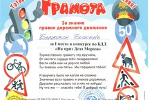 Поздравляем Бычкову Божену, воспитанницу МБДОУ №27, занявшей 1 место в конкурсе по БДД "На приз Деда Мороза", за знание правил дорожного движения.