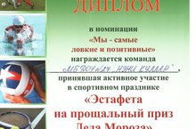 22 января в Прогимназии НГДУ "Ямашнефть" состоялся спортивный праздник "Эстафета на прощальный приз Деда Мороза". В состязании приняли участие 3 команды: воспитанники МБДОУ №27, №50, а также ребята из Прогимназии НГДУ "Ямашнефть". Каждой команде были вручены дипломы и памятные призы. Воспитанники МБДОУ №27 были награждены дипломом в номинации "Мы-самые ловкие и позитивные".