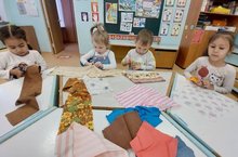 "День работы с тканью" в средней группе "Звёздочки". Аппликация из ткани "Лоскутное одеяло для игрушки".