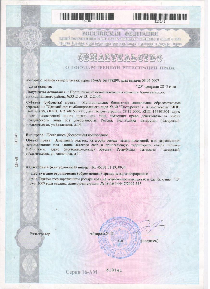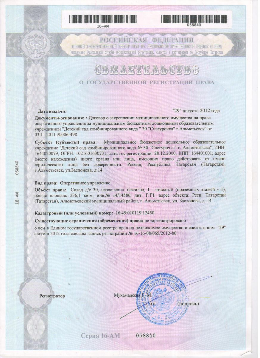 свидетельство о государственной регистрации права на недвижимое имущество детский сад № 30