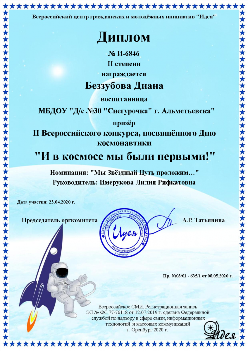 Диплом Аникина Анна 1 место Международная педагогическая ассамблея " Мир космических приключений"