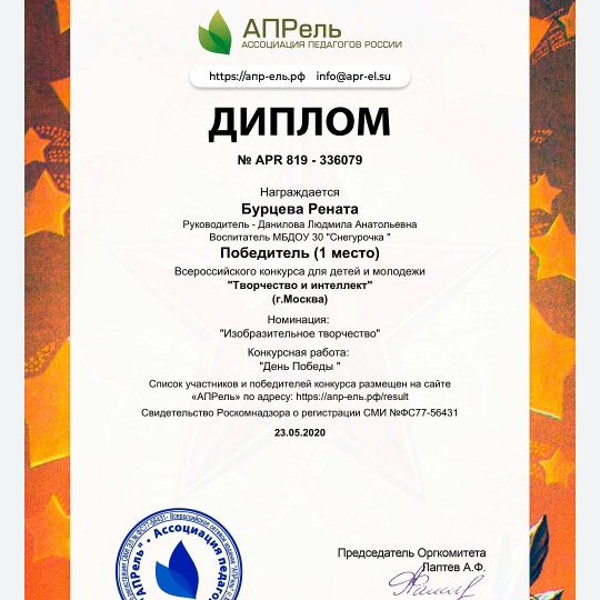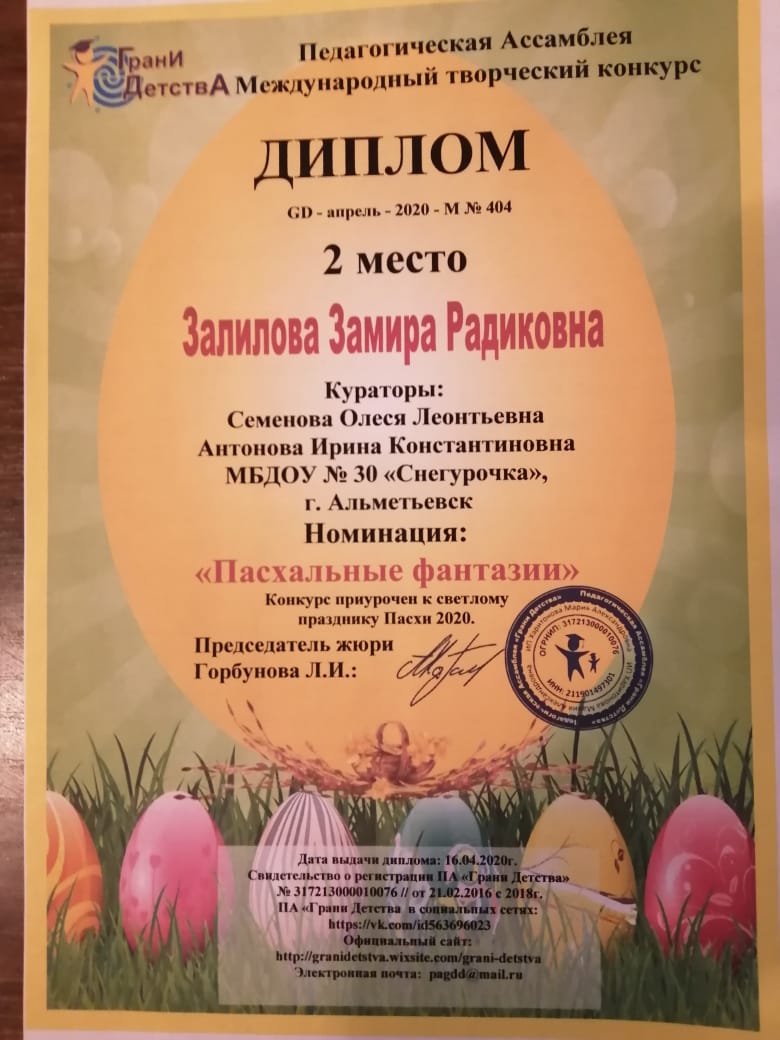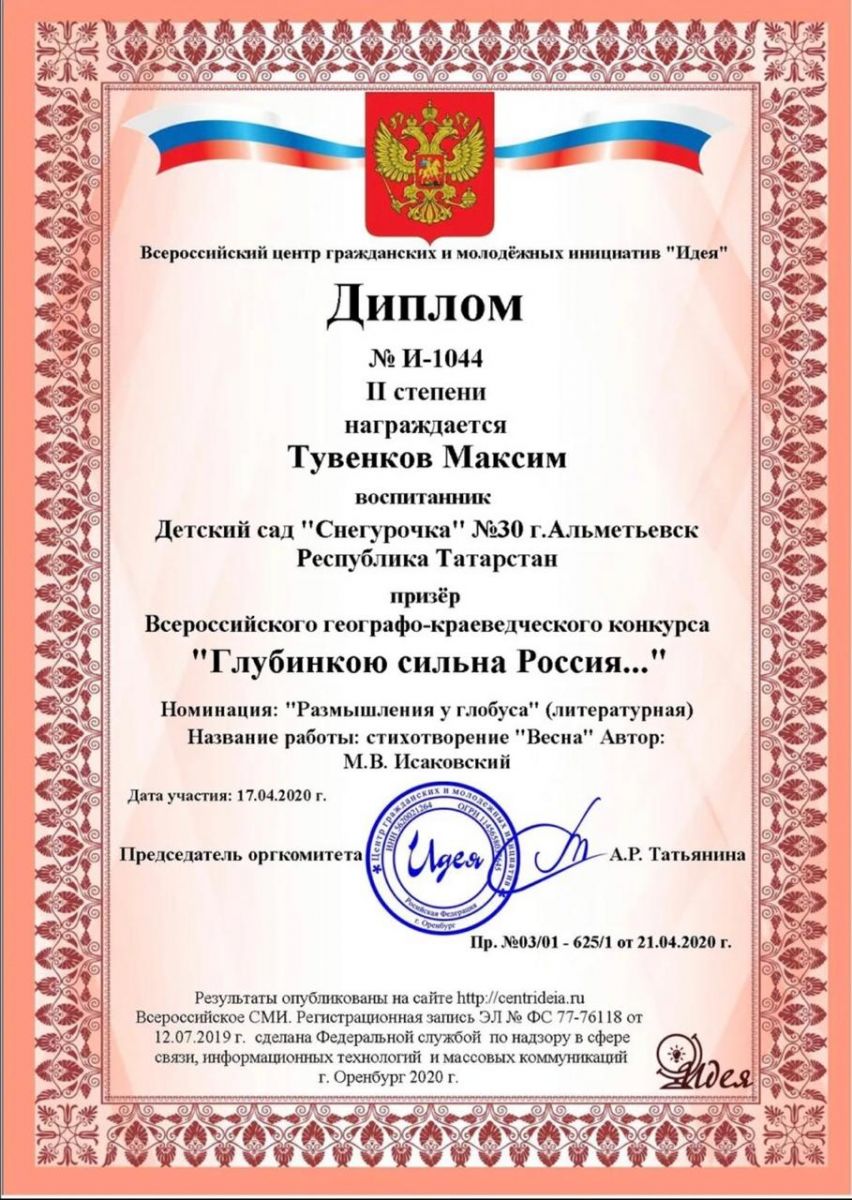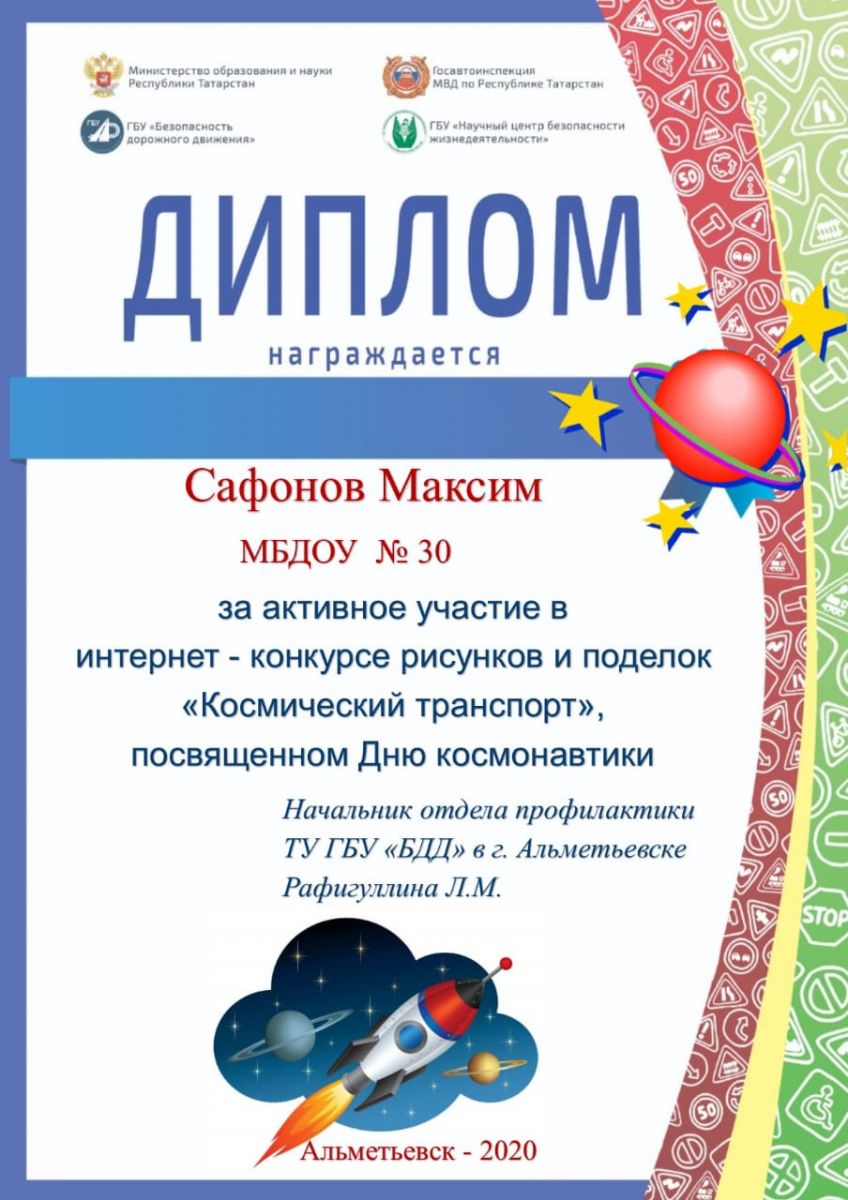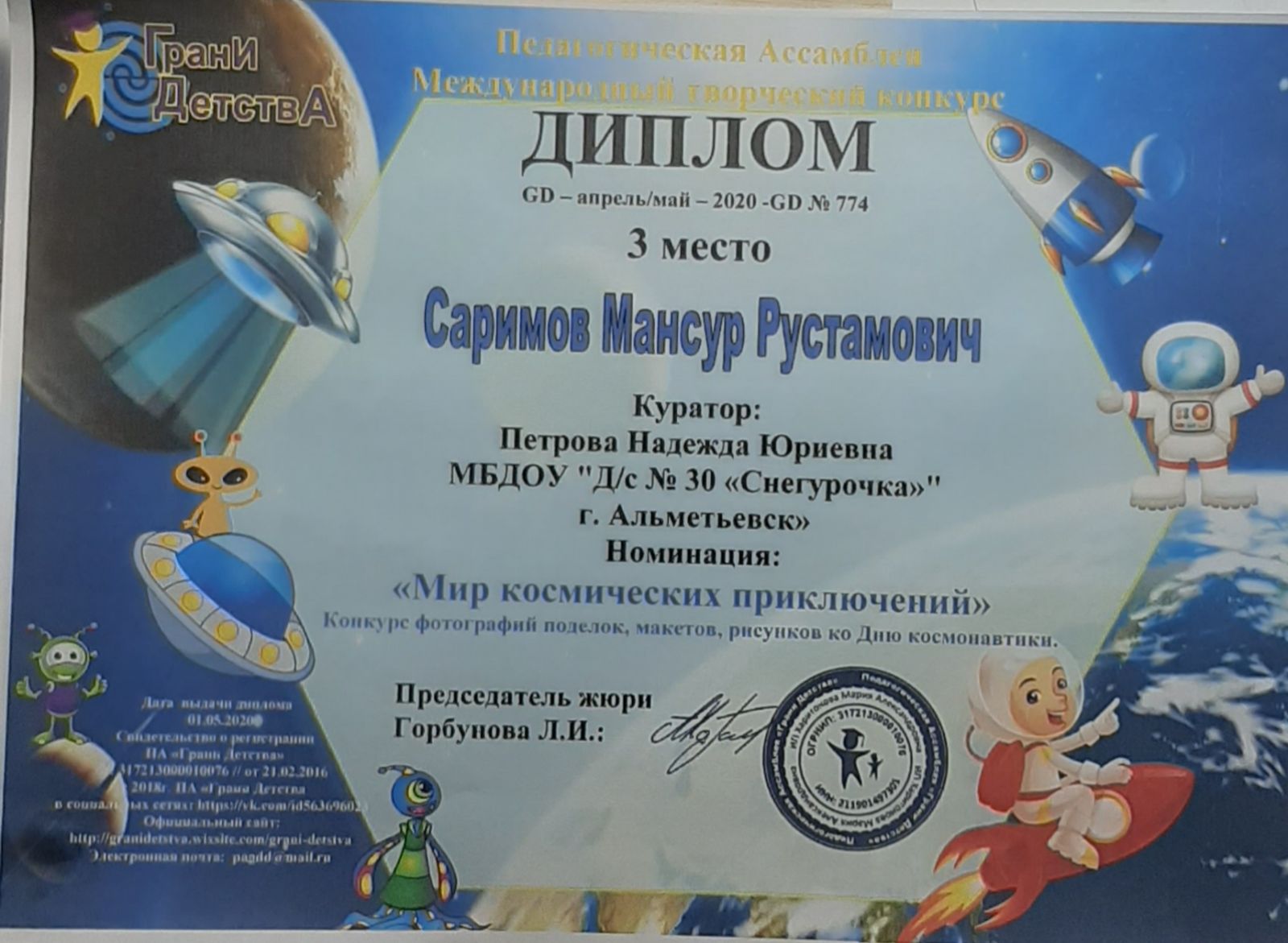 Диплом 1 место за победу во Всероссийском конкурсе детских поделок "Бумажная фантазия" Мустафин Амир