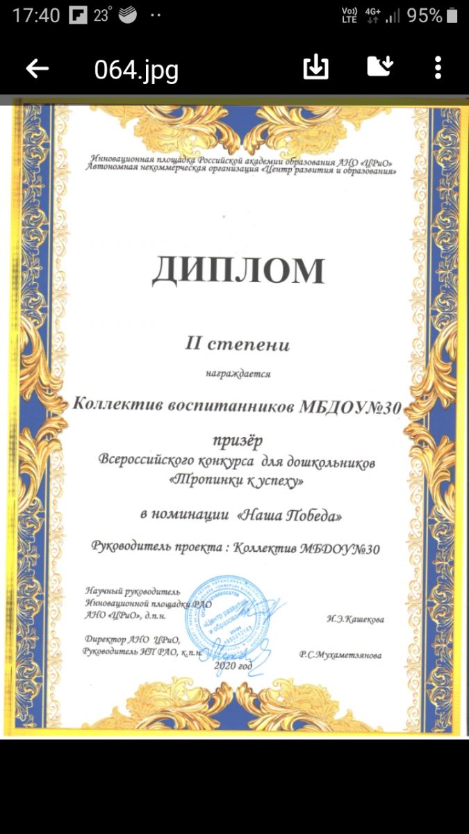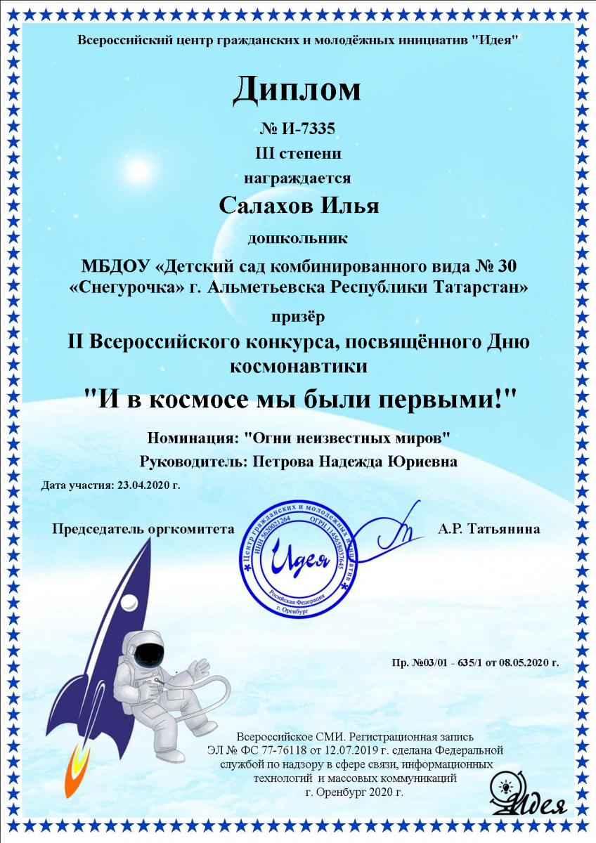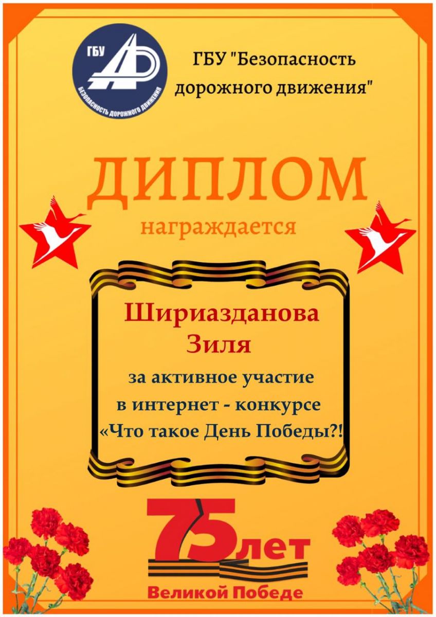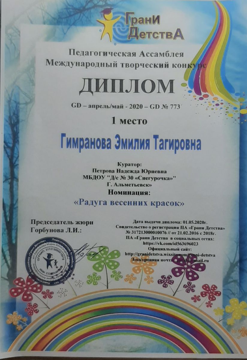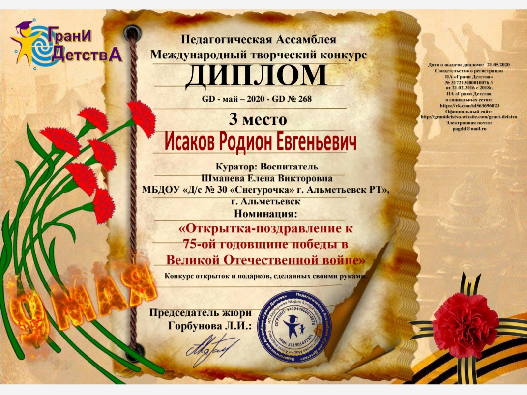 Диплом 1 место за победу во Всероссийском конкурсе детских поделок "Бумажная фантазия" Мустафин Амир