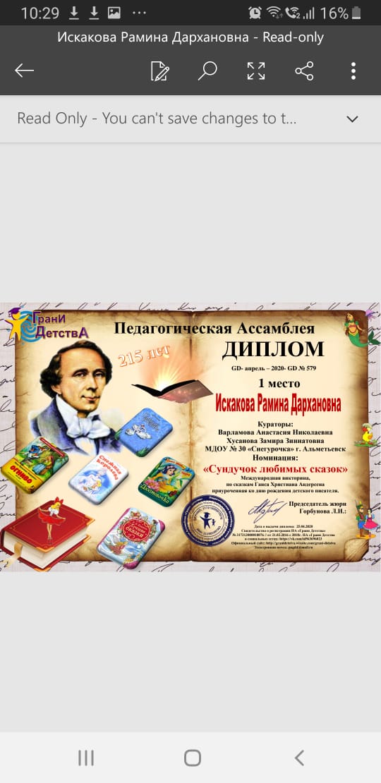 Диплом 1 место Исхакова Рамина педагогическая ассамблея "Сундучок любимых сказок".