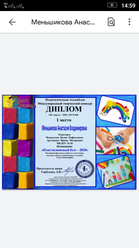 Диплом 1 место Ахметзянов Даниэль педагогическая ассамблея "Пластилиновый бум - 2020"