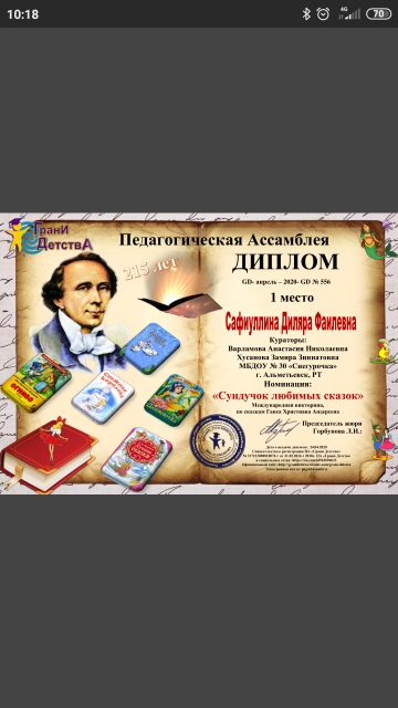 Диплом 1 место Сафиуллина Диляра Педагогическая Ассамблея "Сундучок любимых сказок"