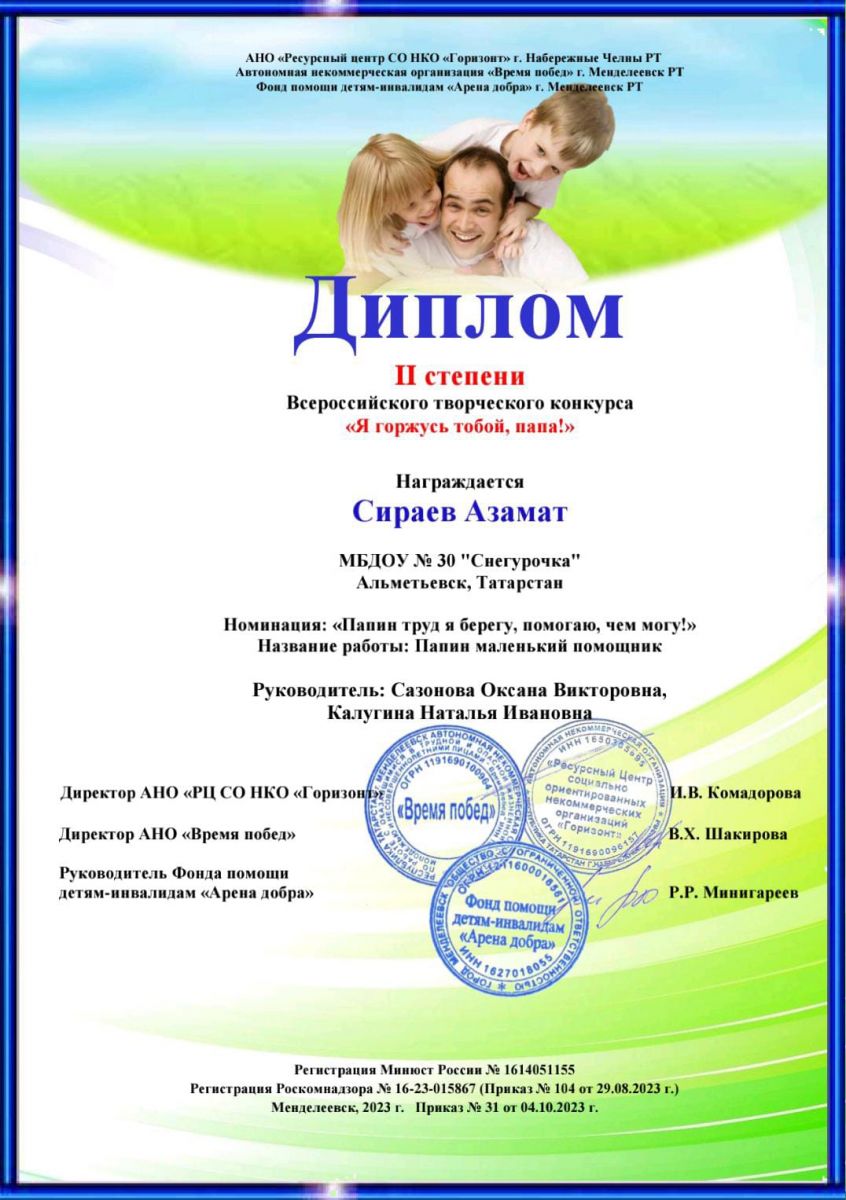 Якупов Ранель диплом 3 степени УО АМР РТ МБУДО "ЦДЮТ" Общественное объединение "Совет отцов АМР" IIрегиональный конкурс семейного творчества "Аты - баты" посвященный Дню защитника Отечества, "Поздравления для папы"