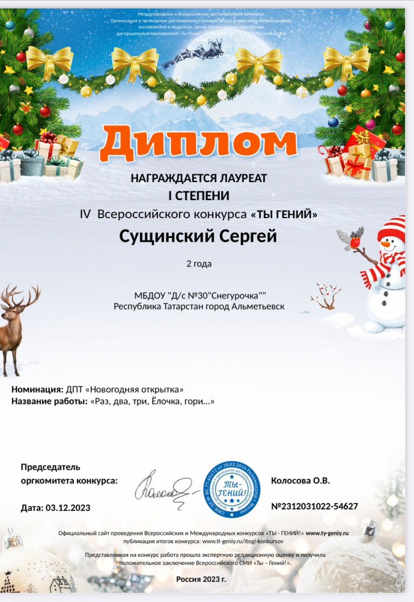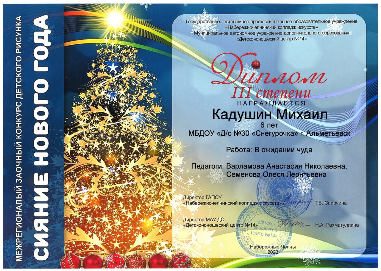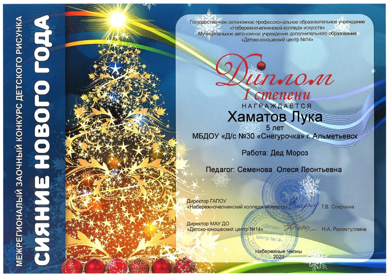 Хаматов Лука диплом 1 степени Государственного автономного профессионального образовательного учреждения "Набережночелнинский колледж искусств" Муниципальное автономное учреждение дополнительного образования "Детско - юношеский центр № 14" "Дед Мороз"
