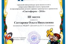 Воспитатель нашего детского сада приняла участие в городском смотре-конкурсе среди воспитателей и дошкольных образовательных учреждений по предупреждению детского дорожно- транспортного травматизма "Светофорик - 2016" и заняла 3 место. Поздравляем с призовым местом.