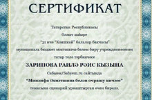 Балалар бакчабызның татар теле тәрбиячесе Зарипова Р.Р. "Сабыем" -балалар, ата-аналар, тәрбиячеләр өчен сайтында эш тәҗрибәсе белән уртаклашты. "Минзифа Әхмәтшина белән очрашу кичәсе" темасына сценарий урнаштырып,кызыклы шигырьләр бастырганы өчен, "Куңелле шигырьләр" исемле сертификат белән бүләкләнде.