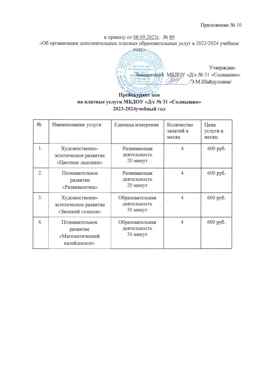 Документ о стоимости услуг - Прейскурант цен на 2023-2024 учебный год
