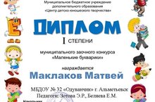Поздравляем воспитанников старшей группы Маклакова Матвея и Долинина Арсения с дипломами 1 степени в муниципальном заочном конкурсе "Маленькие букварики", которое проводило УО АМР РТ совместно с МБУ дополнительного образования " Центр детско-юношеского творчества ".