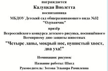 Поздравляем Калуцкую Виолетту воспитанницу старшей группы МБДОУ "Д/с №32 "Одуванчик" с дипломом II степени во Всероссийском конкурсе детского рисунка, посвященного Всемирному дню защиты животных "Четыре лапы, мокрый нос, пушистый хвост, два уха!" в номинации "Рисунок", название работы "Шкед", руководитель Зотова Эльвира Рамилевна.