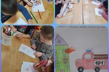 Дети в подготовительной группе ещё раз вспомнили про профессию пожарного. Обсудили как вести себя при пожаре. И изобразили все в своих рисунках. -