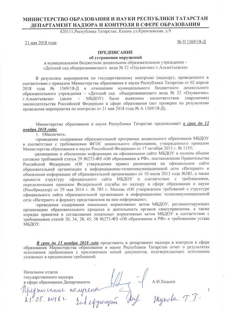 Предписания органов, осуществляющих государственный контроль и отчеты об исполнении // Белем алу сферасында дәүләт тикшерүе (күзәтүе) үткәрүче әгъзаларның боерыклары