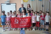 Первый секретарь Альметьевского горкома КПРФ Агафонов Александр Федорович вручил воспитанника МБДОУ №35 «Маленькая страна» копию Знамени Победы .