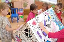 В группе "Солнышко"появился вот такой большой картонный домик, подаренный родителями. Ребята дружно, весело начали его раскрашивать. Кто то крышу, кто то стены. Получился расписной, яркий дом. У него открываются окна, дверь, даже можно залезть внутрь поиграть. Вот как здорово. Спасибо большое за такой подарок.
