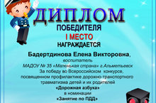 Поздравляем воспитателя Бадертинову Елену Викторовну с победой во Всероссийском конкурсе, посвященном профилактике дорожно-транспортного травматизма детей и их родителей «Дорожная азбука» в номинации «Занятие по ПДД»
