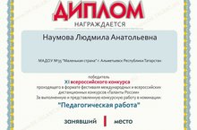 Поздравляем воспитателя Наумову Людмилу Анатольевну победителя (1 место) ХI всероссийского конкурса «Таланты России» в номинации «Педагогическая работа».