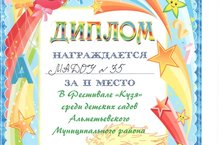 Воспитанники подготовительной к школе группы «Умники и умницы» и «Веселые ребята» приняли активное участие в спортивном Фестивале детских дошкольных учреждений «Кузя» на базе МАУ ДОД «ДЮСШ по футболу», организаторами которого были МАУ ДОД «ДЮСШ по футболу» и Управление образования Альметьевского муниципального района. Ребята соревновались в «Веселых стартах» и вышли в финал.