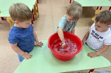 В 1 мл группе «Кроха» закрепили представления о свойствах воды.Вода, как известно, обладает рядом уникальных свойств, о которых ребенку будет интересно узнать. Конечно, в обычной жизни малыш часто взаимодействует с водой и поэтому сам уже давно интуитивно понял, что она не имеет ни формы, ни вкуса. Однако такие опыты все-таки нужны для того, чтобы акцентировать внимание ребенка на этих свойствах и показать, что вода – это уникальное вещество. Набрали тёплую воду и смотрели как губка впитывает воду ,запускали кораблики .Далее в таз с теплой водой налили жидкое мыло ,затем венчиком взбивали .Когда появилась пена предложили детям потрогать ,поиграть ,подуть . Воспитатель Мовламова Д.З.