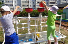 Летом в жару самое любимое из развлечений – плескаться в воде! Какие игры с водой можно придумать? Самые разные, на любой вкус! А если еще можно включить логику, то польза от игр с водой удваивается! Наш проект «Трубы ПВХ для игр и труда» в такую жару пользуется огромным успехом. В группе «Светофорик» папы соорудили не просто центр воды, а настоящий водяной лабиринт. Дети могут сами или по заданию проложить дорогу воде, открывая и закрывая краны в нужных местах. А можно устроить морской бой в бассейне или искупать любимую куклу. Сколько удовольствия для детей жарким летом приносит вода!