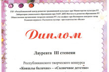 Поздравляем воспитателя по обучению детей татарскому языку Усманову Р.М. с получением диплома лауреата III степени Республиканского творческого конкурса "Кояшлы балачак" - "Солнечное детство" в номинации "Ачык дәрес" - "Открытый урок". Молодец"