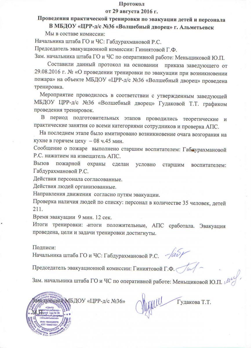 29 августа в нашем детском саду была проведена практическая тренировка по эвакуации детей и персонала на основании приказа заведующего Т.Т.Гудаковой от 29.08.2016г. "О проведении тренировки по эвакуации при возникновении пожара".