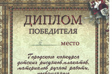 Поздравляем коллектив нашего детского сада с получением диплома победителя (III место) в городском конкурсе детских рисунков, плакатов, материалов ручной работы, посвящённого "Дню семьи,любви и верности". Благодарим воспитателей Чехонину И.И., Кашину Р.А., Тимакову Т.А., Юнусову Ф.Ф., Шарипову Г.Д., родителей Ипеевой Алёны (поделка "Терем, терем, теремок") и Мордвиновой Виктории (рисунок "Семья. Любовь.Верность", группа "Детство"), Тимакова Дмитрия (рисунок "Моя семья", группа "Радость"), Майорова Ивана (поделка "Ромашковое счастье", группа "Теремок"), Шарипова Рамазана (рисунок "СемьЯ", группа "Светофорик"). Коллекцию поделок, созданных из газетных трубочек, с применением техники декупаж представила воспитатель Гиниятова Г.Ф.: "Гнёздышки", "Рог изобилия", "Тили-тили-тесто, жених и невеста", "Домовёнок с ложкой-загребушкой"и др. С праздником!