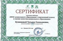 Сертификат участника вебинара "ФГОС дошкольногоо образования:современный подход к оценке качества дошкольного образования" получила воспитатель Кузнецова Татьяна Геннадиевна.