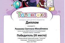 Поздравляем учителя - логопеда Рузанову Светлану Михайловну, победителя (III место) IV Всероссийского творческого конкурса "Талантоха" в номинации "Литературное творчество" за стихи "Маме"!