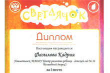 Поздравляем Фазылову Кадрию с получением дипломов Национальной образовательной программы «Интеллектуально-творческий потенциал России» за первое место в рамках второго этапа «Волшебная зима» Всероссийского конкурса для дошкольников «Светлячок». Она заняла первое место в познавательно-творческих конкурсах «Играем и считаем (4-7 лет), «Загадки окружающего мира (4-7 лет), «Весёлые слова и буквы (4-7 лет). Благодарим родителей Кадрии, воспитателей Чентаеву В.Е. и Нуриахмедову Е.В. за отличную подготовку призёра. МОЛОДЦЫ!
