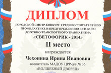 Поздравляем воспитателя Чехонину Ирину Ивановну с победой (Диплом II место) в городском конкурсе среди воспитателей по профилактике и предупреждению детского дорожного-транспортного травматизма "Светофорик-2014".МОЛОДЕЦ!!!