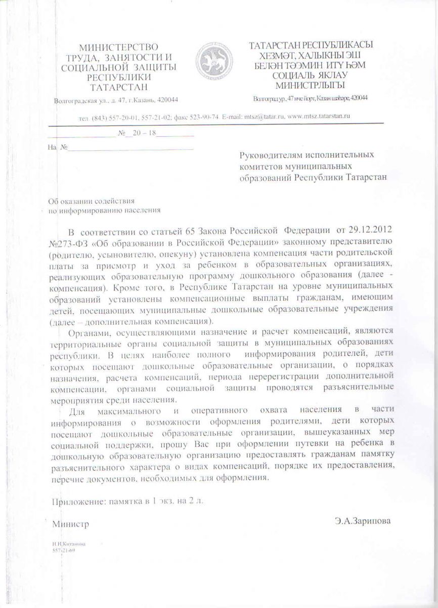 Памятка по установлению компенсации родительской платы за присмотр и уход за ребёнком в ОО