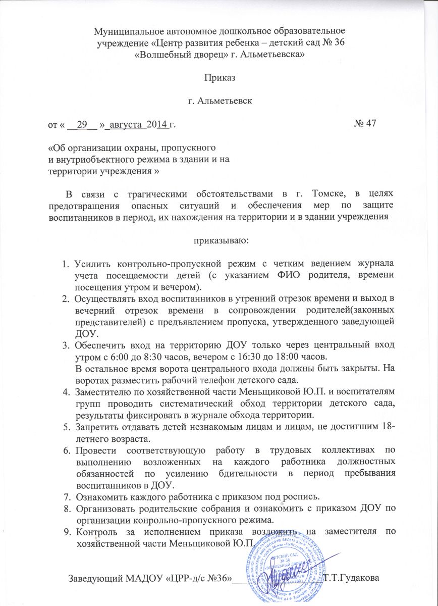 Приказ ""Об организации охраны пропускного и внутриобъектного режима в здании и на территории ДОУ"